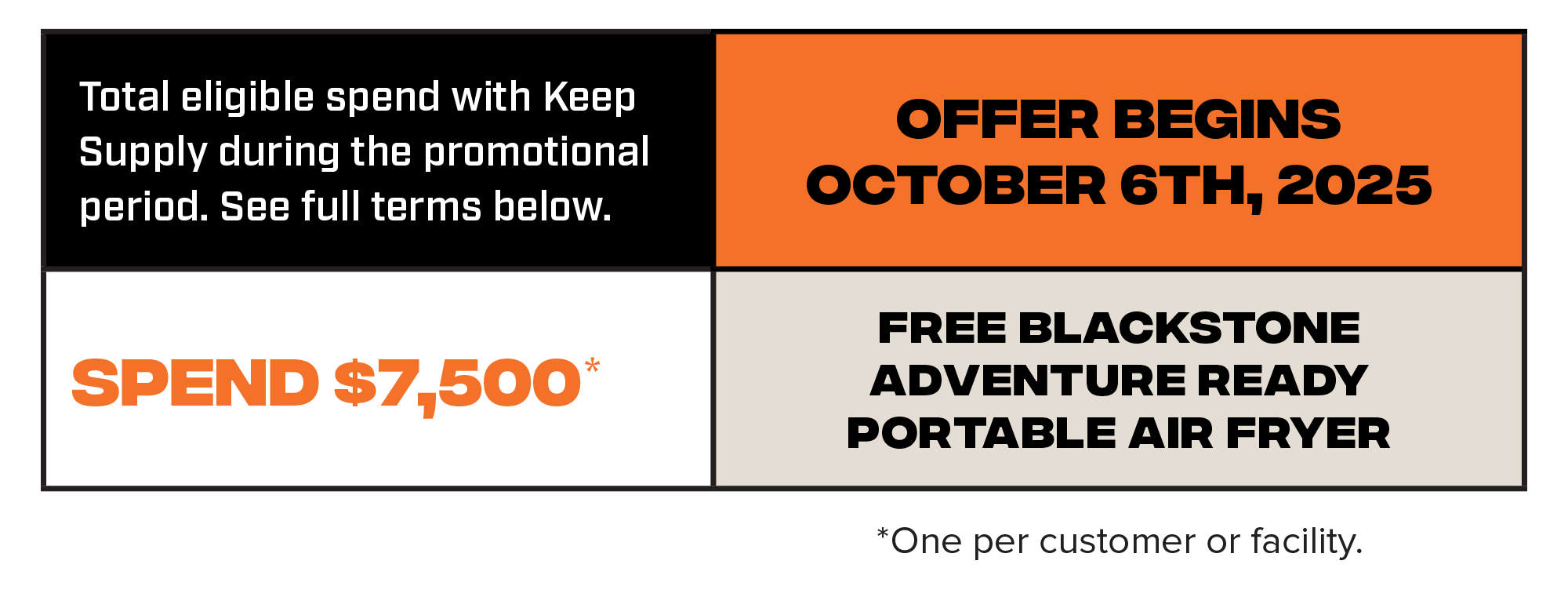Terms: Offer valid on purchase orders and online orders received 10/6/2025 - 10/31/2025 11:59 pm CDT. Offer is only valid on orders through keepsupply.com or by phone or email via our direct sales team. Free offer can be exchanged for a $200 account credit on your next purchase. Not valid on previous purchases and cannot be combined with any other discounts or promotions. Limit one per customer or facility. Offer is only eligible to be shipped within the United States. Keep Supply has the right to end or modify the offer at any time. While supplies last.